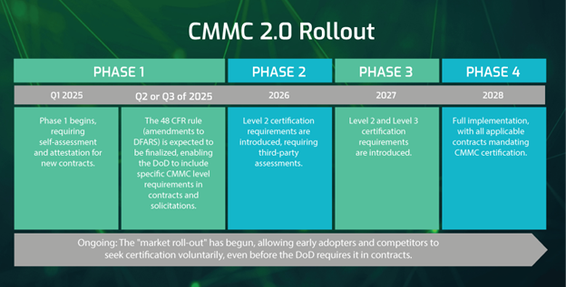 CMMC Level 2, which applies to contractors handling CUI, will be required for DoD contracts in a phased rollout. The first phase will start in mid-2025, and full implementation is expected by 2028. This means defense contractors have limited time to prepare for compliance. Organizations that handle CUI should begin their certification journey well before these deadlines to ensure they can continue to bid on and win DoD contracts as the requirements come into effect.