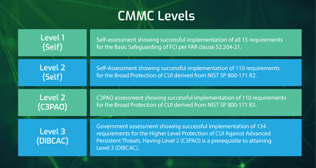 An Organization Seeking Assessment (OSA) will select the CMMC level it desires to attain based on the requirements and a CMMC Third-party Assessor Organization (C3PAO) where necessary. Once the CMMC Program is implemented, a DoD solicitation will specify the minimum CMMC Status required to be eligible for award. The following CMMC levels are outlined below: